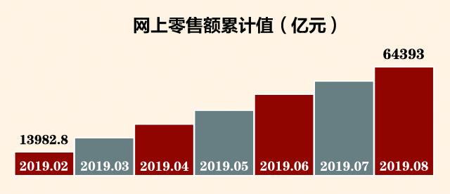 数据显示,1-8月份,全国网上零售额达64393亿元,同比增长16.8%。其中,实物商品网上零售额达50745亿元,增长20.8%,占社会消费品零售总额的比重为19.4%,比上年同期提高2.1个百分点。